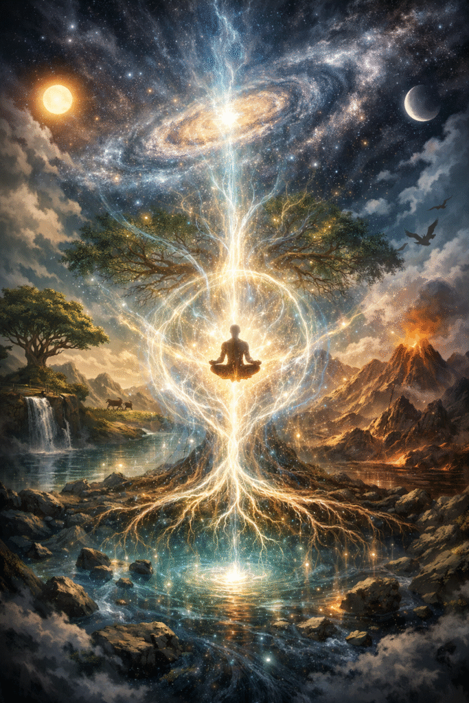 A Força era um fluxo primordial, vivo e sem nome — a presença invisível que sustentava o equilíbrio de tudo o que existe. Não era magia, no sentido simplista da palavra. Era natureza em sua forma mais profunda: um campo vivo, gerado pela própria vida, que envolve, atravessa e conecta todas as coisas.